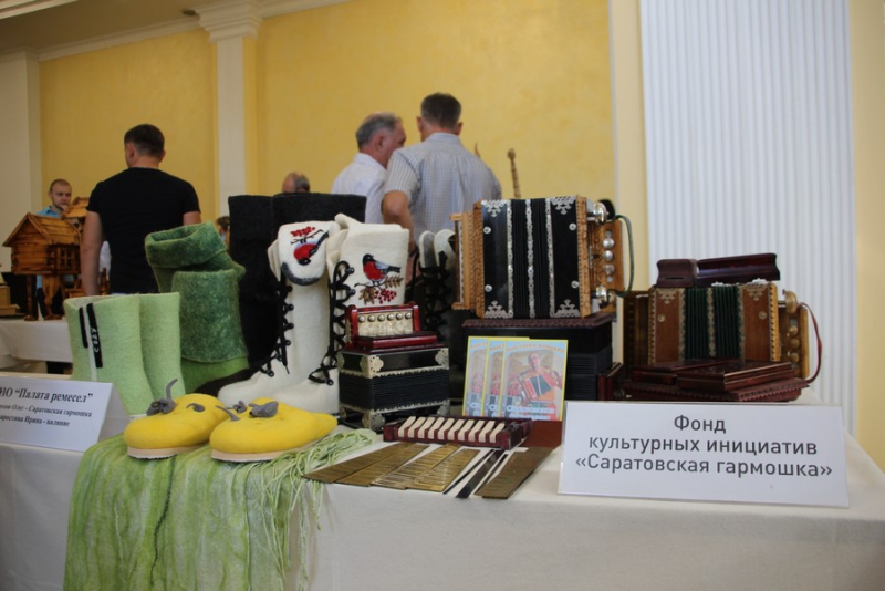 На выставке представлены изделия из дерева из Балашовского, Татищевского района, керамики, глины, варежки и домашние тапочки от «Палаты ремесел», саратовские гармошки, литьё из бронзы.На выставке изделий из дерева из Татищевского района губернатор рассказал, что в одной из поездок увидел этих мастеров и попросил приехать в Саратов, чтобы показать свои изделия.