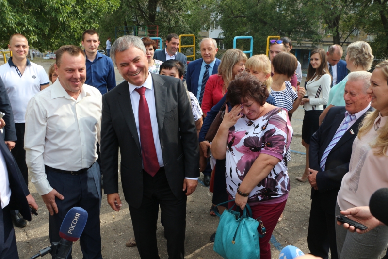 По пути к учреждению председатель Госдумы заметил сидевших во дворе жилого дома пенсионерок. Одна из них решила познакомить с политиком своего маленького внука. Вячеслав Викторович не стал отказываться и взял малыша на руки, пообщался немного с его бабушкой и вернул потом ей мальчика.
