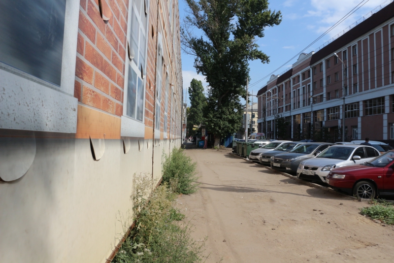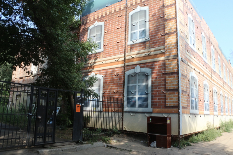 В марте дом на Аткарской завесили фальшфасадом. Спустя полгода после страшного пожара со стороны улицы дом №33 остается прикрытым баннером с нарисованным красивым зданием, но с обратной стороны картина совсем иная.