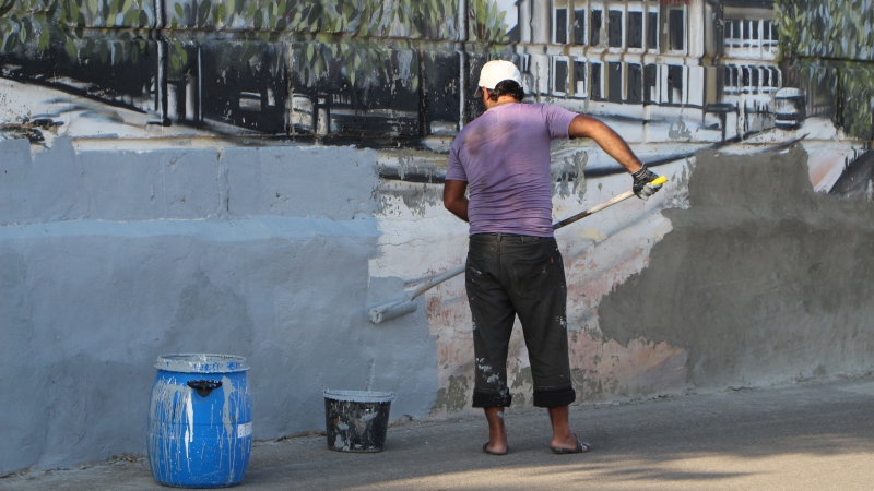 В работах задействованы два маляра. Мужчины успели за день закрасить несколько пролетов бетонного забора в районе Бабушкиного взвоза. Почти все граффити облезли, их ошкурили и заштукатурили. Большую часть из них еще можно увидеть, но на некоторых уже с трудом можно разглядеть героя или надпись.