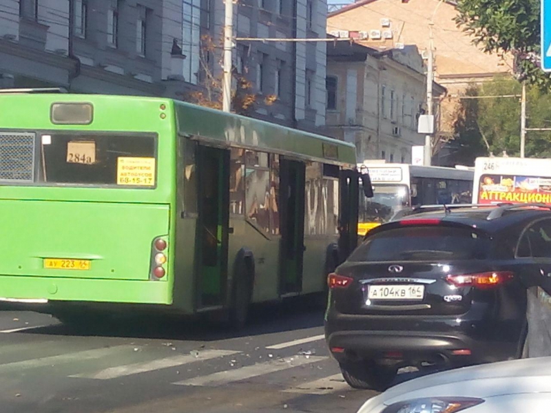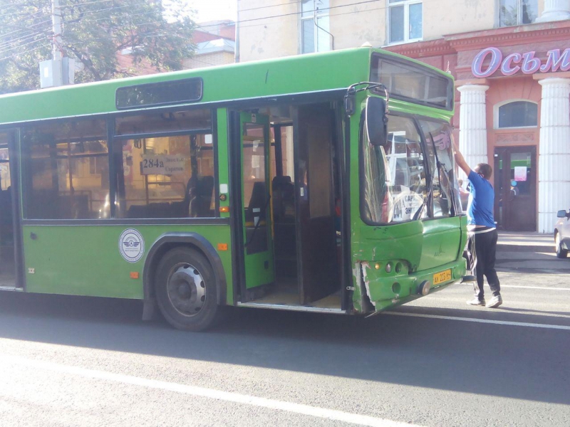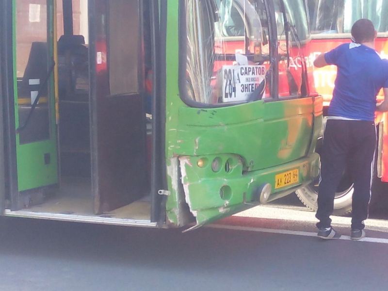 Сегодня утром в центре Саратова автомобиль «Инфинити» врезался в автобус №284А. В итоге один выехал на встречку, другой – на тротуар.