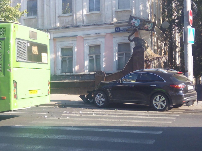 У общественного транспорта незначительные повреждения передней части, а вот у «Инфинити» серьезно пострадал капот, а передний бампер почти полностью оторвался. Автобус, чтобы избежать столкновения, выехал на встречную полосу, а «Инфинити» на тротуар.