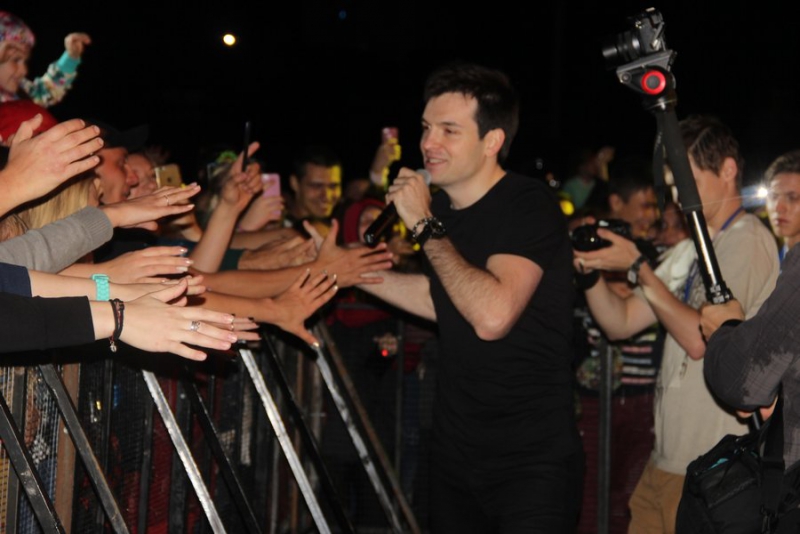 «Сегодня у нас оператора нет», - в шутку пояснили они. Затем участники группы спели свои композиции. Они периодически снимали публику, подпевающую им, на телефон и выкладывали в соцсети. Певцы активно общались со зрителями: бросали в толпу огромные надувные шары, пели с ними а капелла и даже выбегали в толпу, пожимая им руки.