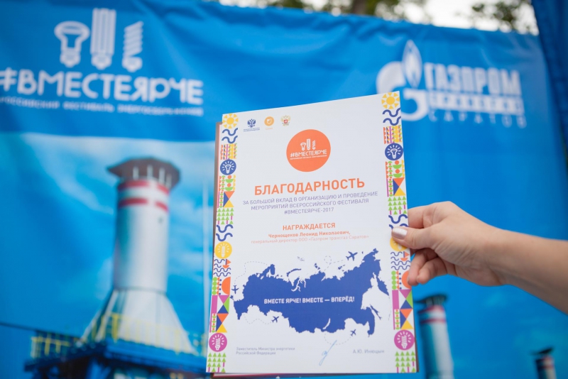За большой вклад в организацию и проведение мероприятий Всероссийского фестиваля #ВместеЯрче-2017 генеральному директору ООО «Газпром трансгаз Саратов» Леониду Чернощекову и коллективу предприятия была объявлена благодарность Министерства энергетики Российской Федерации.