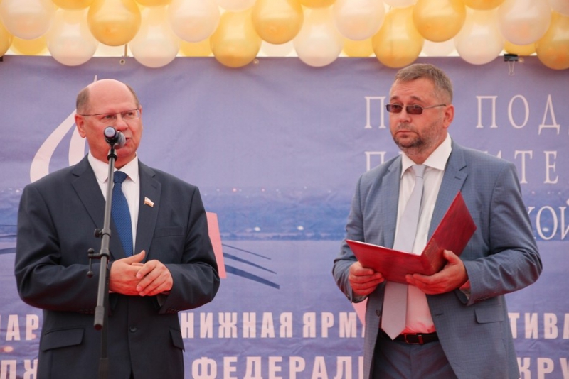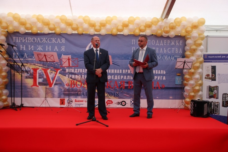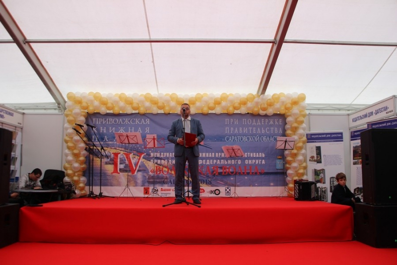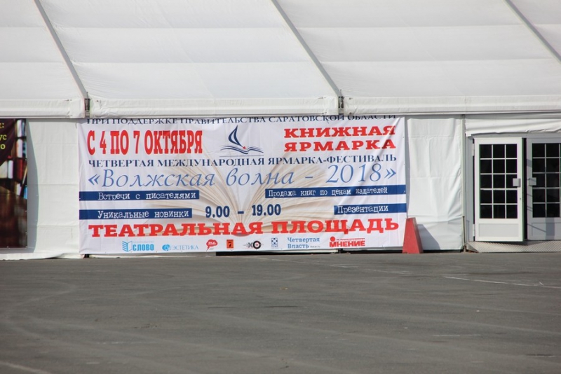 Сегодня в Саратове на Театральной площади состоялось торжественное открытие IV Международной книжной ярмарки-фестиваля «Волжская волна-2018». Специально для праздника на площади поставили павильон, где и разместились участники с книгами. Ведущим открытия выступил директор Приволжской книжной палаты Владимир Иванов.