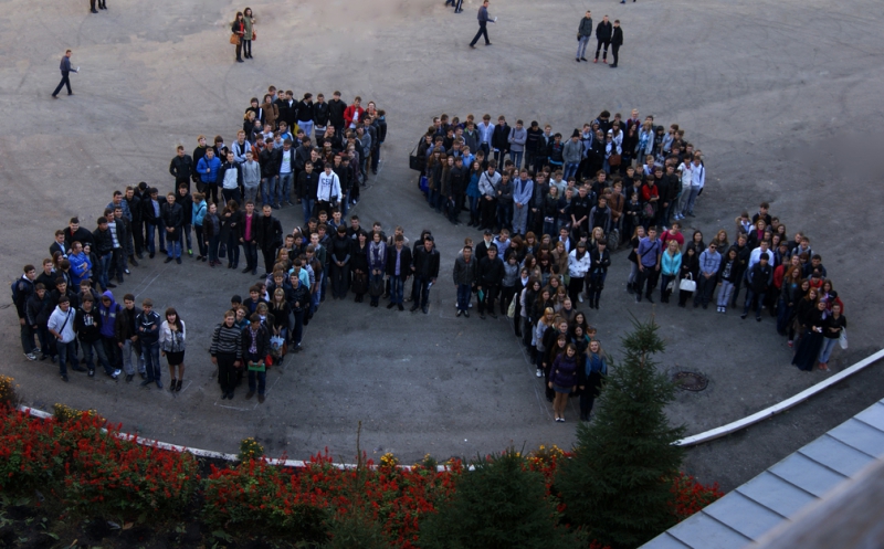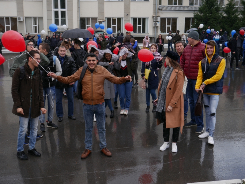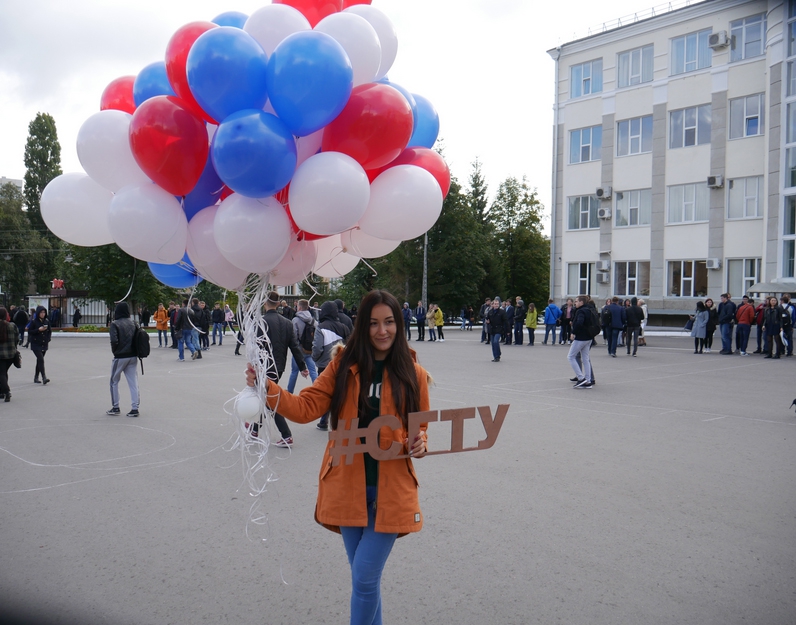 На большой перемене более 200 студентов и сотрудников приняли участие во флешмобе, выстроившись в форме цифры 88 и аббревиатуры СГТУ на главной площади вуза.