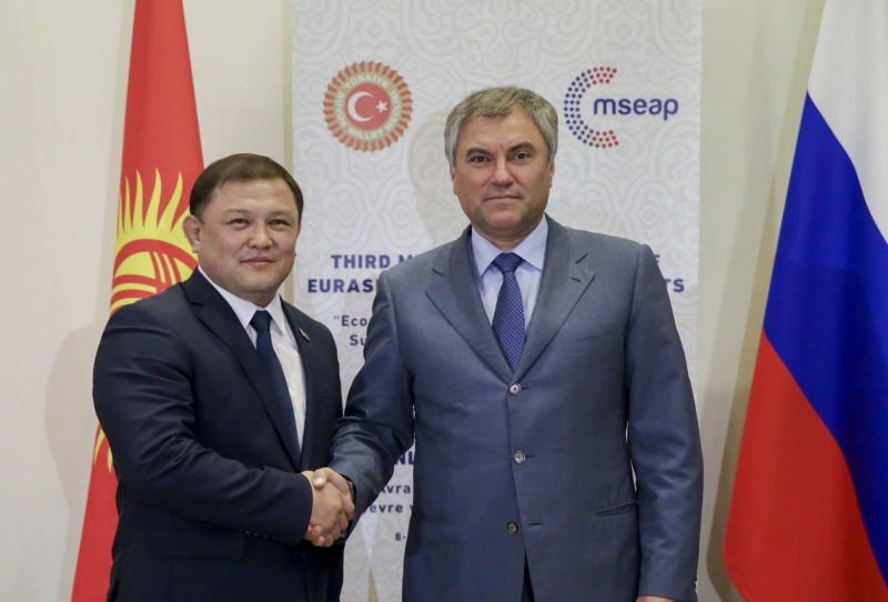 На встрече председателя ГД Вячеслава Володина и председателя Жогорку Кенеша Киргизии Дастанбека Джумабекова отмечалась важность развития межпарламентского сотрудничества и двусторонних отношений стран.
