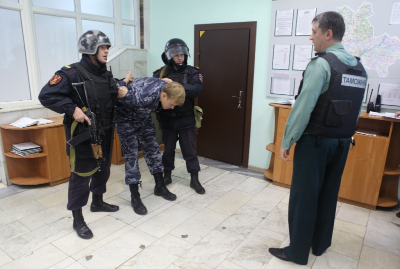По сценарию, преступники с огнестрельным оружием проникли на территорию таможни, чтобы захватить административное здание. Дежурный передал информацию силовым ведомствам, и к месту стянулись оперативные группы. Они быстро заблокировали территорию и выявили посторонних лиц, задержали их и провели опознание.