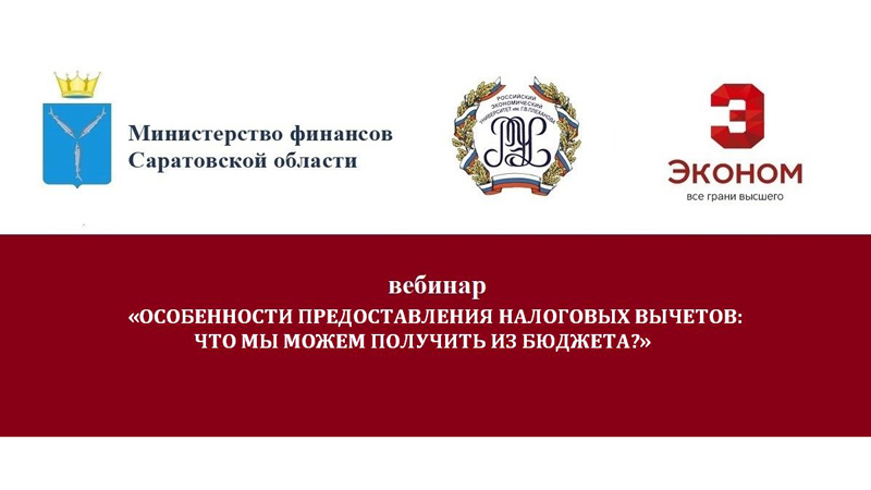 19 октября в 12.00 в Саратовском социально-экономическом институте РЭУ имени Г.В. Плеханова состоится вебинар «Особенности предоставления налоговых вычетов: что мы можем получить из бюджета?». Мероприятие пройдет в рамках реализации основного мероприятия «Повышение бюджетной грамотности в Саратовской области» подпрограммы «Управление региональными финансами Саратовской области» государственной программы Саратовской области «Развитие государственного и муниципального управления до 2020 года».