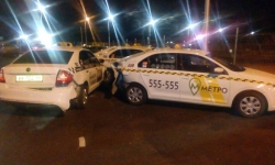 Предположительно, сегодня ночью водитель одного из автомобилей «Шкода» с эмблемой такси «Метро» не справился с управлением и врезался в припаркованные транспортные средства. Буквально проломив багажник одно из «Шкод», легковушка столкнулась в другую, а та – в стоявшую рядом.