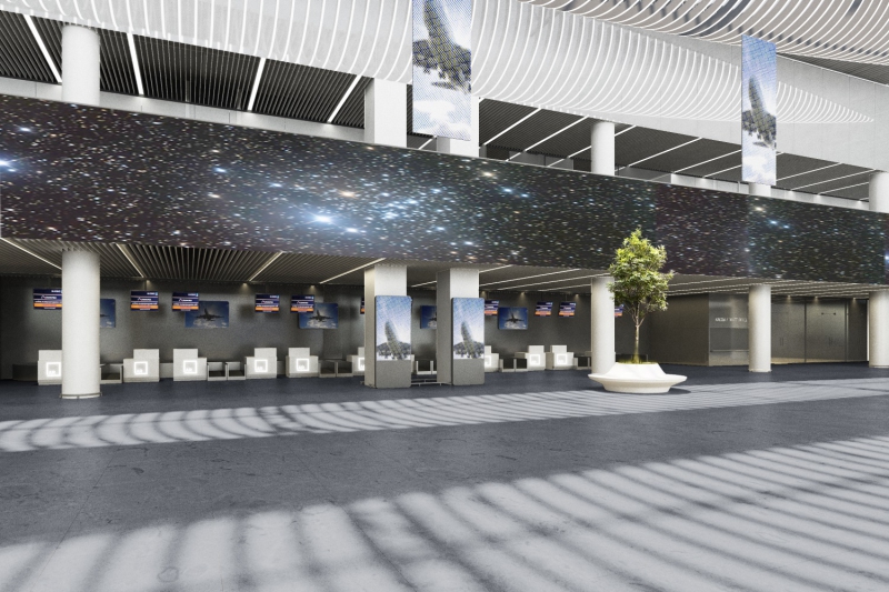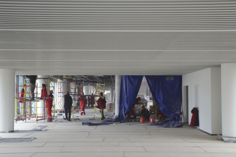 В секторах вылетов и прилетов внутренних и международных рейсов строители укладывают напольное покрытие из керамогранита и монтируют подвесные потолки из металлических ламелей. В соответствии с концепцией дизайна интерьеров в отделке применяются материалы белого и серого цветов, а также элементы декора из нержавеющей стали.