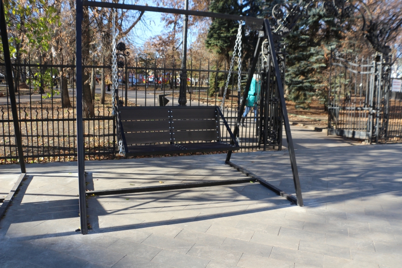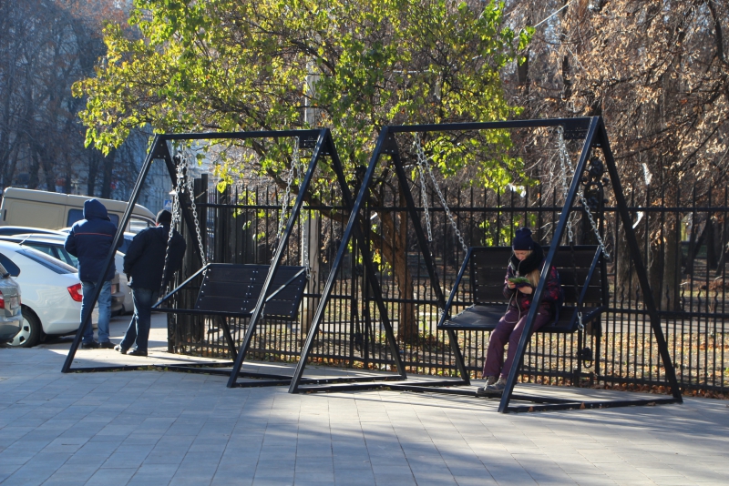 В Саратове на пешеходной улице Волжской установили парные качели для взрослых. В минувшие выходные их расположили у входа в парк «Липки», рядом с трамваем «Семен».