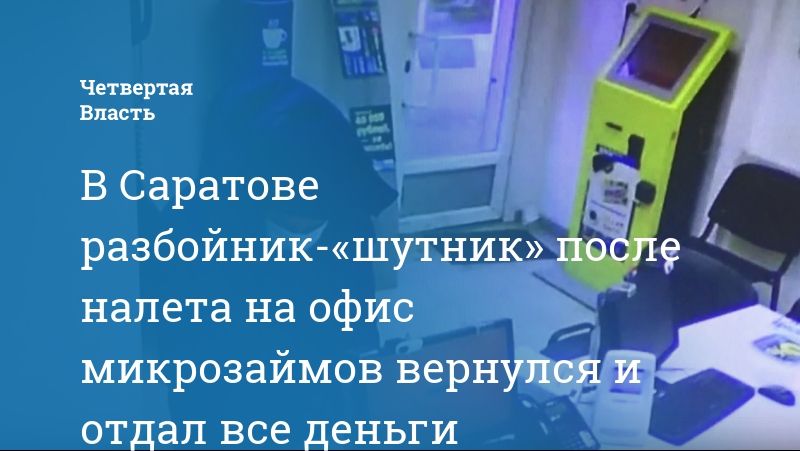 Мужчина, совершивший разбойное нападение на офис микрокредитной организации в Ленинском районе Саратова, вскоре вернул сотруднице деньги и назвал произошедшее шуткой. Видеозапись с места преступления сегодня обнародовали сотрудники регионального ГУ МВД.