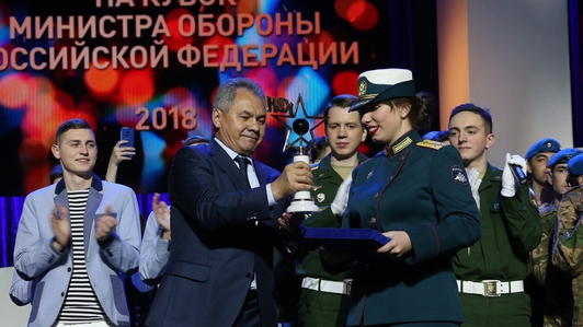 Главный приз команде вручили министр обороны Сергей Шойгу и президент Международного союза КВН Александр Масляков. Капитану Дарье Денисюк министр подарил свою фуражку.