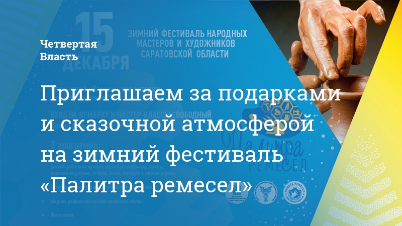 15 декабря в парке-музее «Россия – моя история» пройдет зимний фестиваль народных мастеров и художников Саратовской области «Палитра ремесел», а также церемония подведения итогов конкурса «Ремесленник года – 2018». Организатором мероприятия выступает АНО «Палата ремесел Саратовской области» при поддержке министерства экономического развития региона.