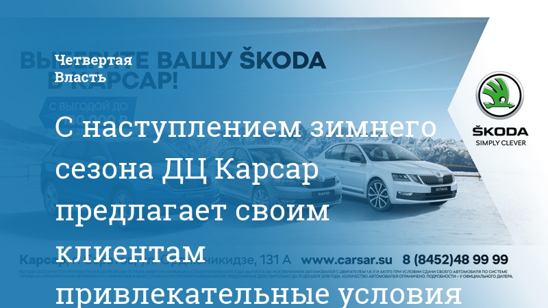 С наступлением зимнего сезона ДЦ Карсар предлагает своим клиентам привлекательные условия на покупку автомобилей марки Škoda