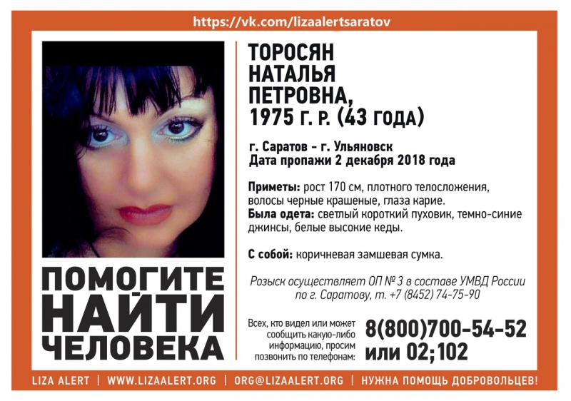 В Саратове пропала 43-летняя жительница Ульяновска Наталья Торосян. Об этом сообщает поисковый отряд «Лиза Алерт».