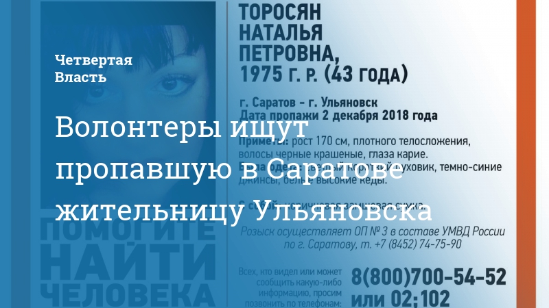 Последний раз женщину видели 2 декабря. Региональный куратор волонтерского движения Константин Костырин уточнил «Четвертой Власти», что пропавшая может находиться как в Саратове, так и в родном городе, а равно на пути из одного города в другой.