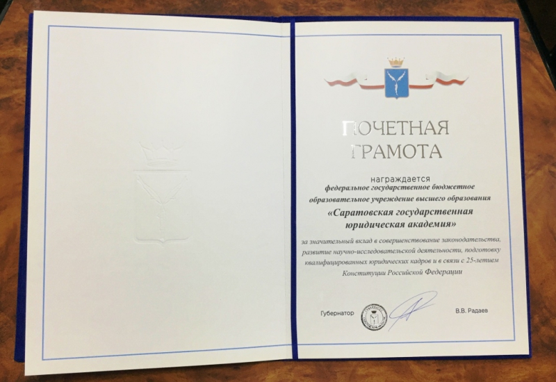 Также в рамках торжественного мероприятия, приуроченного ко Дню Конституции РФ, Валерий Радаев вручил почетную грамоту Саратовской государственной юридической академии «За значительный вклад в совершенствование законодательства, развитие научно-исследовательской деятельности, подготовку квалифицированных юридических кадров и в связи с 25-летием Конституции Российской Федерации», благодарность коллективу кафедры конституционного права СГЮА и Почетный знак губернатора Саратовской области «За любовь к родной земле» профессору СГЮА Владимиру Кабышеву.