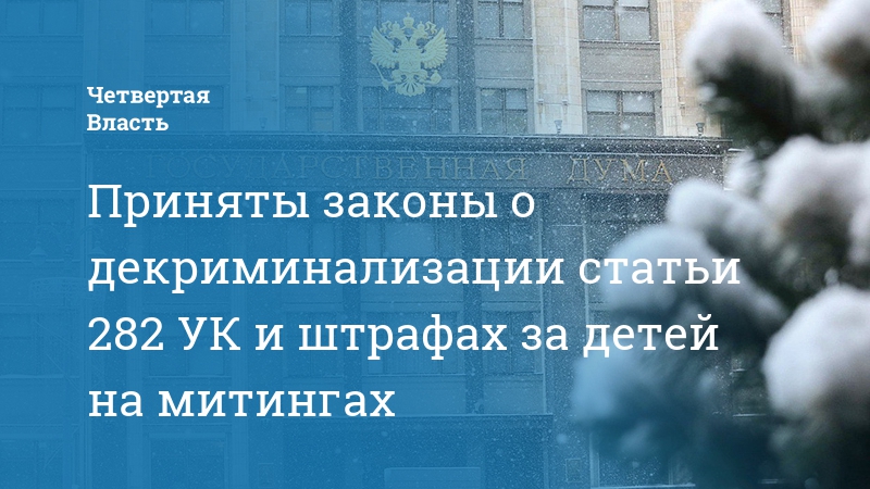 Сегодня в Госдуме депутаты приняли в 3-м, окончательном чтении ряд законов, среди которых частичная декриминализация статьи 282 УК РФ об экстремизме и введении штрафов за присутствие детей на несанкционированных акциях.