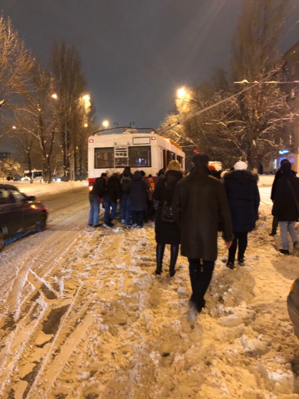 В Ленинском районе, у остановки Техстекло на проспекте Строителей, пассажирам приходилось толкать застрявший в снегу троллейбус №10.