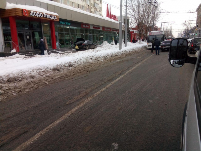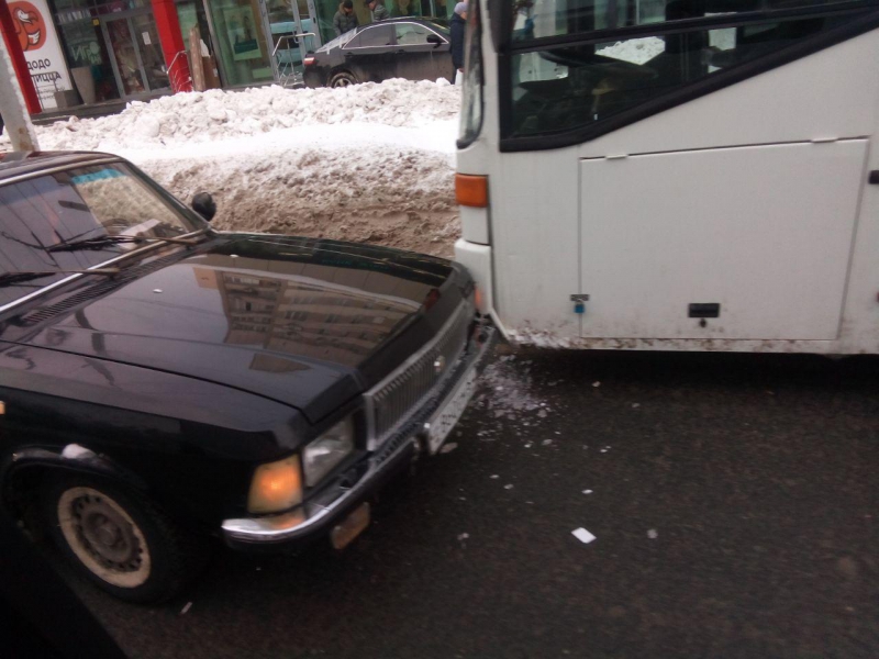 У торгового центра «Москва» (недалеко от пересечения с улицей Чапаева) столкнулись автобус маршрута №6 и легковушка «Волга». Автомобили ехали навстречу друг другу, но общественный транспорт немного сдвинулся за пределы полосы, поскольку ему не хватило места из-за нерасчищенной из-за снега обочины.