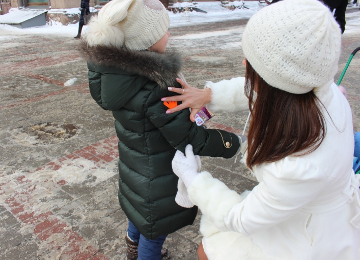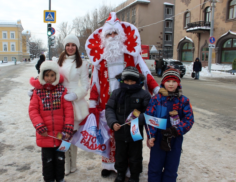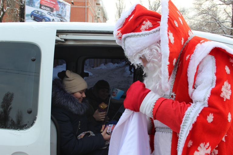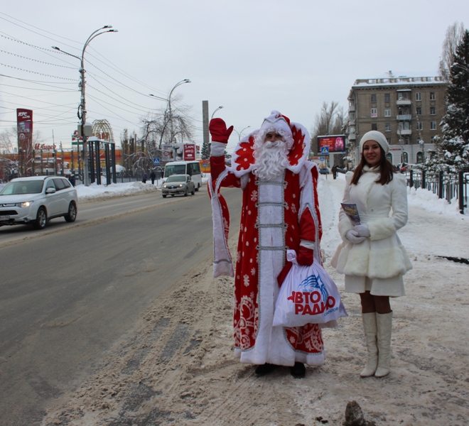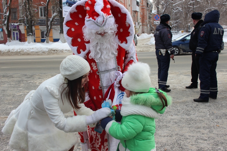 Одевшись в облачение Деда Мороза и Снегурочки, участники веселого похода встречали прохожих с детьми, поздравляли их с наступающими праздниками и дарили малышам сладкие подарки, а также световозвращающие элементы.