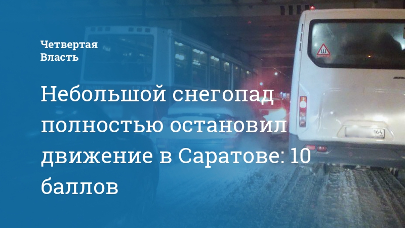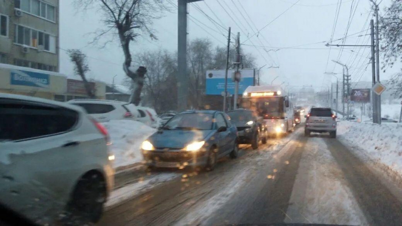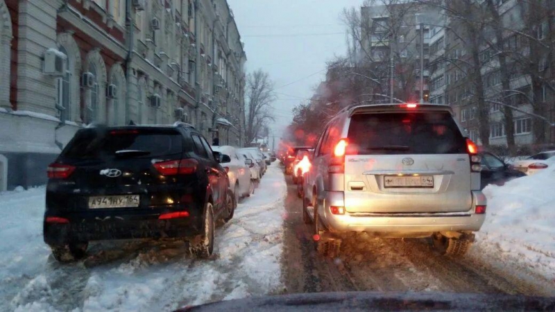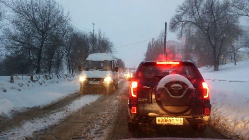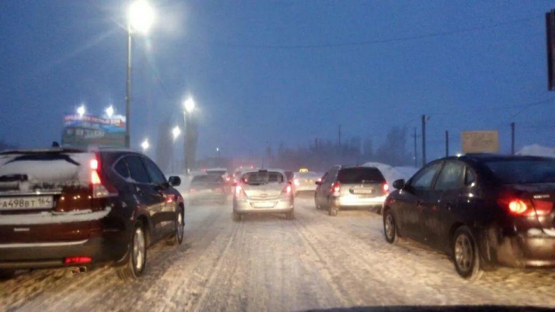 Небольшой снегопад полностью остановил движение в Саратове: 10 баллов