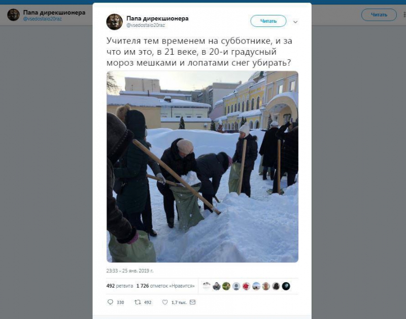 Фотография появилась в Твиттере* на странице пользователя «Папа дирекшионера». На ней были запечатлены несколько женщин, собирающих лопатами снег в мешки. Этот факт вызвал недовольство у пользователей, некоторые высмеяли и неординарный способ уборки снега.