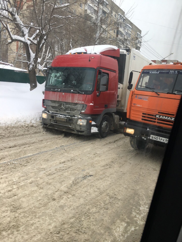 В Саратове застрявшие фуры затрудняют автомобильное движение. Очевидцы в соцсетях сообщают, что такая ситуация наблюдается одновременно в нескольких районах города.