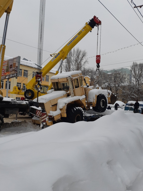 Сломавшийся трактор грузили на полуприцеп с помощью двух кранов большой грузоподъемности. Из-за работ пришлось перекрывать часть проспекта Энтузиастов от улицы Орджоникидзе.