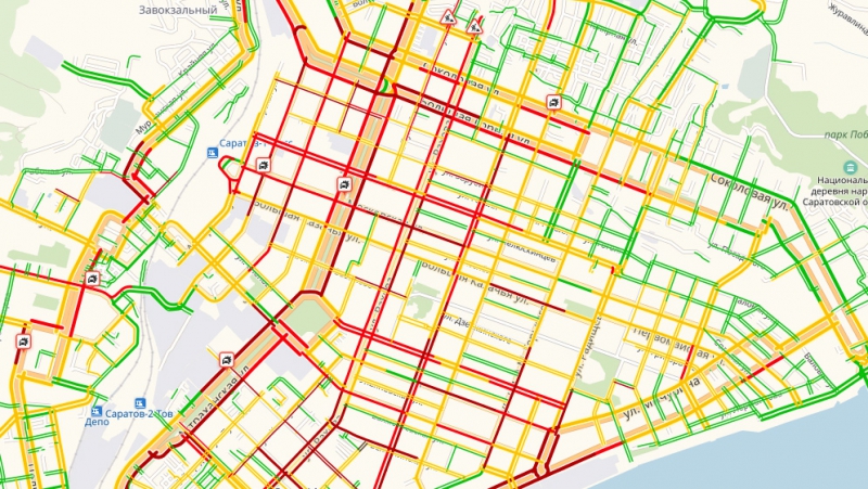 Вечером в Саратове вновь значительно осложнено движение транспорта. По данным портала «Яндекс.Пробки», заторы достигли 10 баллов, проще идти пешком, чем ехать на машинах.