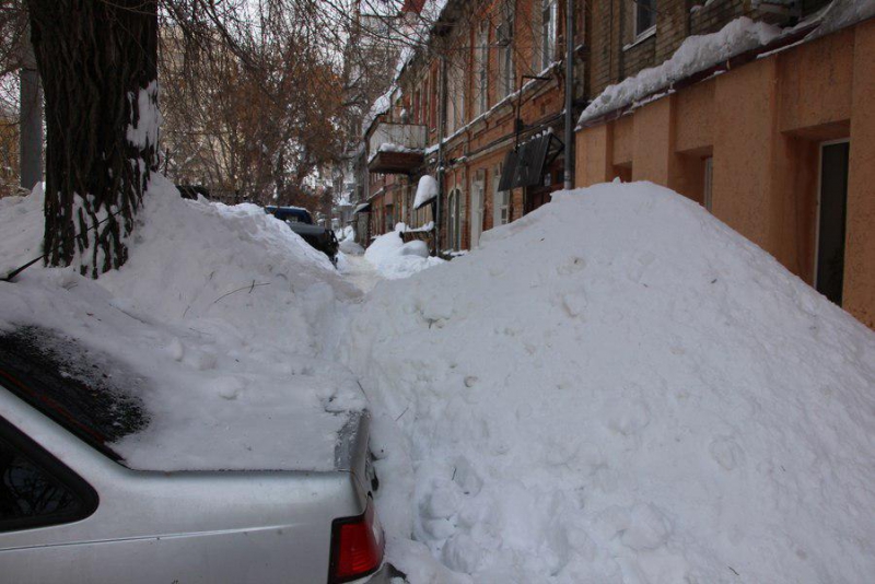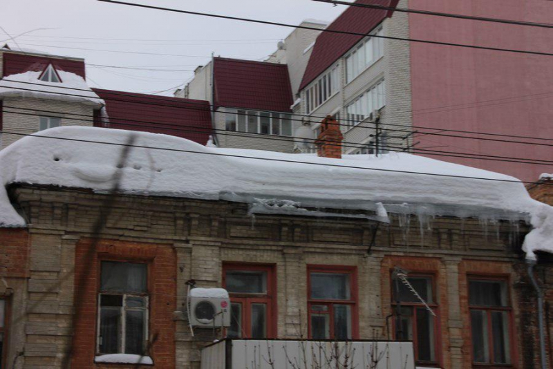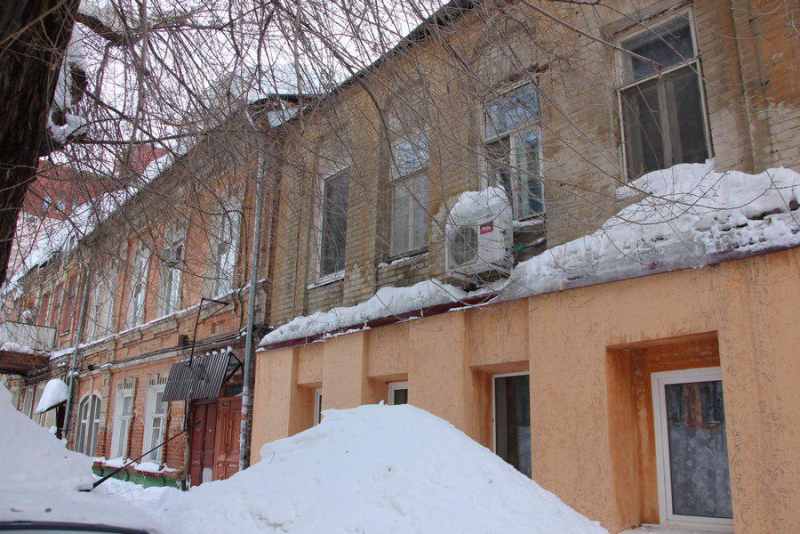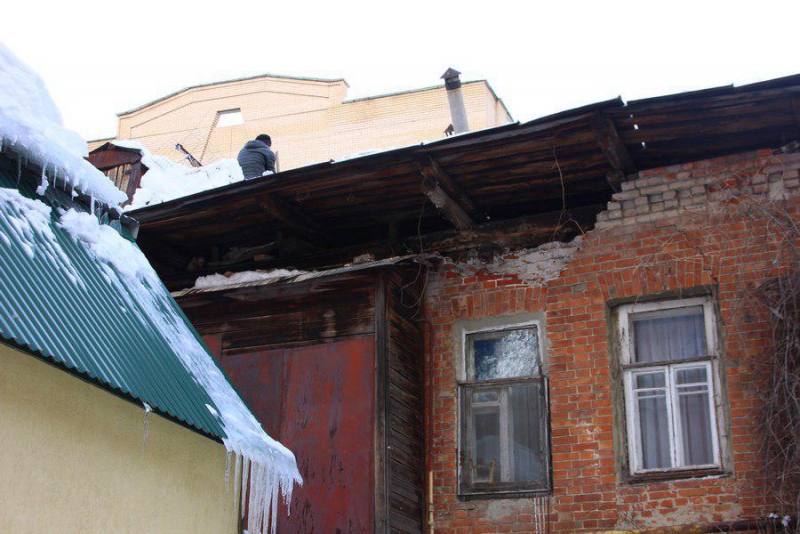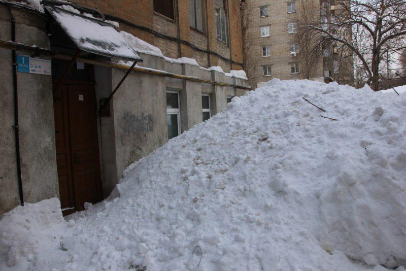 Сброшенный с крыши снег образовал огромные сугробы по обе стороны от арки дома на тротуаре, а также во дворе здания. Примечательно, что на соседних зданиях, примерно таких же по возрасту двухэтажных домах, на крышах по-прежнему лежат огромные пласты снега.