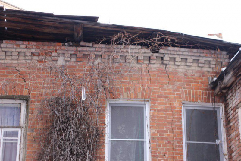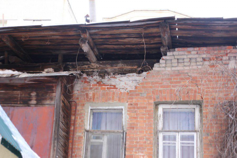 Крыша дома практически провалилась внутрь дома. Между листами настила образовались большие зазоры, а удерживающие кровлю доски почти прогнили. Повреждения оказались в обоих крыльях здания, справа и слева от арки. Кроме того, декоративная кирпичная кладка, находящаяся над аркой, также сильно завалилась внутрь дома.