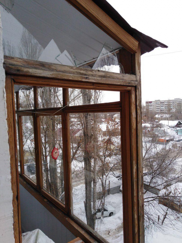 «Крыша повреждена, рама, стекла все выбиты, под моим балконом ливневка разрублена пополам - сбросили лед», - жалуется саратовчанка. Она добавила, что очистка крыши пока не помогла, и в квартире под натяжным потолком стоит вода, которую они с мужем сливают в ведра. Наумова добавила, что кроме ее балкона во время очистки крыши повредили два кондиционера - на пятом и втором этажах.