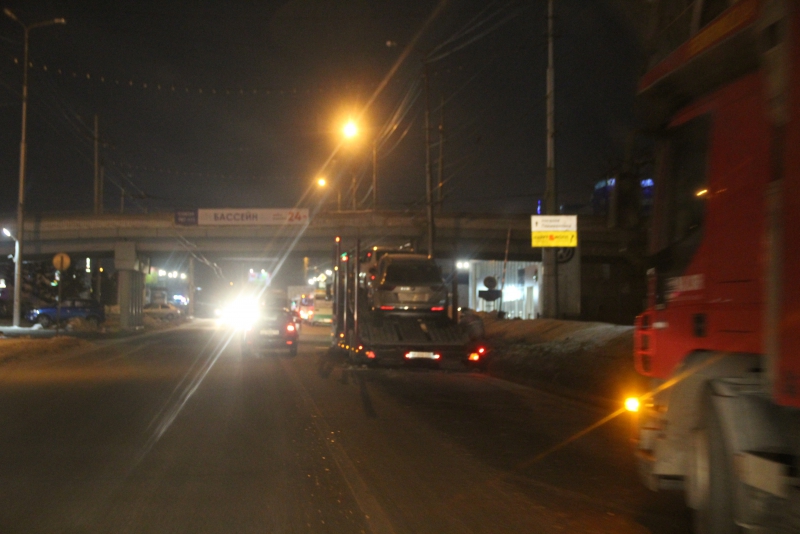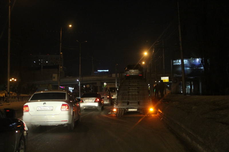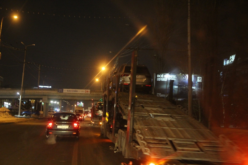 Около 20.00 два автовоза, доставившие товар в автосалон «Элвис», полностью перекрыли участок дороги, ведущий в сторону 3-й Дачной. Крупногабаритный транспорт занял единственную пригодную для движения полосу между Торговым центром и 3-й Дачной.