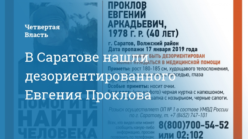 В Саратове найден живым пропавший 17 января 40-летний Евгений Проклов. Об этом сегодня, 14 февраля, сообщает поисковый отряд «Лиза Алерт».