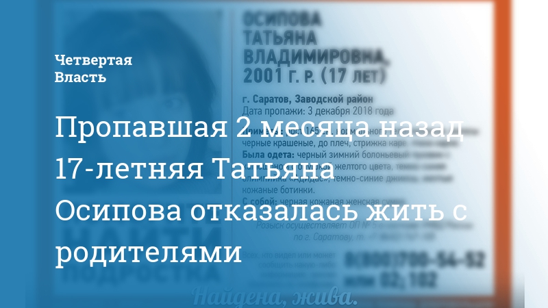 Пропавшая 2 месяца назад 17-летняя Татьяна Осипова отказалась жить с родителями
