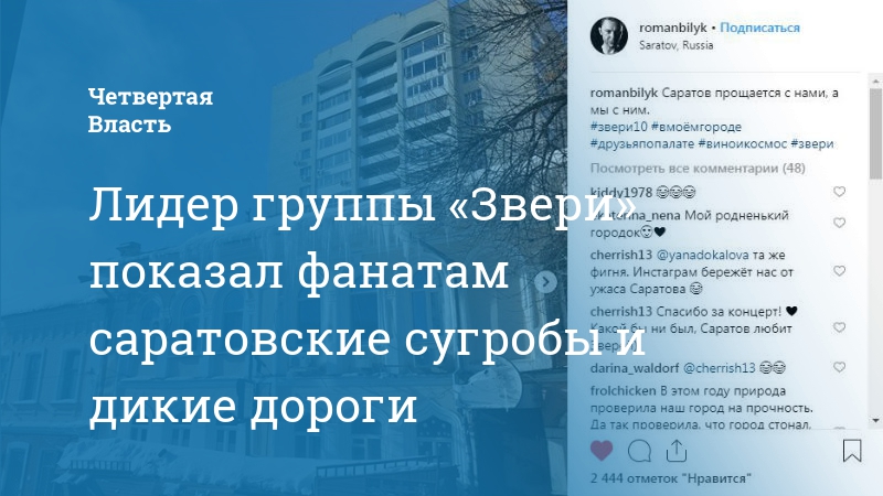 Концерт группы «Звери» состоялся в Саратове вчера. До этого артисты побывали в Саранске и Пензе, но оттуда Роман Билык опубликовал только видеозаписи выступлений.
