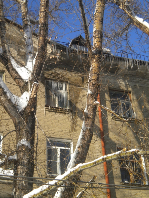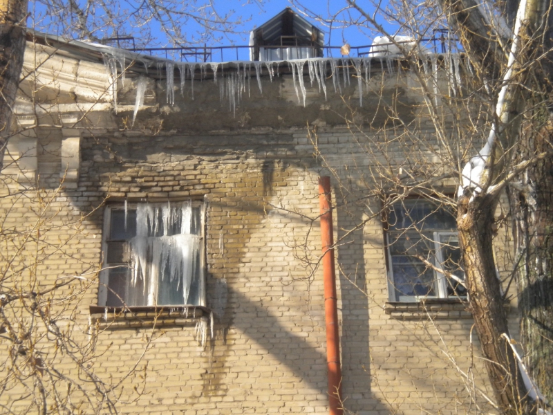 Речь идет о доме №106Б (корпус №6) по улице 2-я Садовая. На опубликованных снимках видно сосульки и лежащий на крыше снег, а также участок стены, пропитанный влагой. Кирпичная кладка под крышей начинает разрушаться.