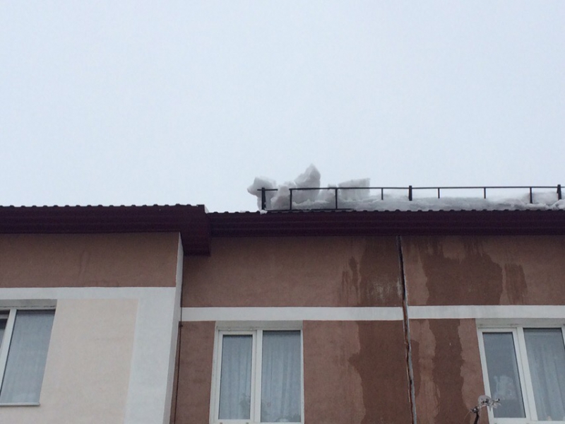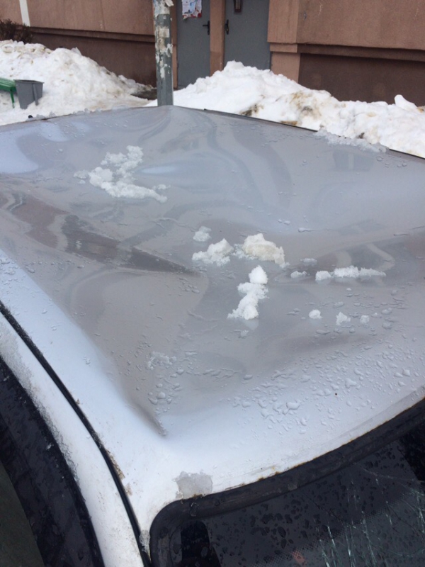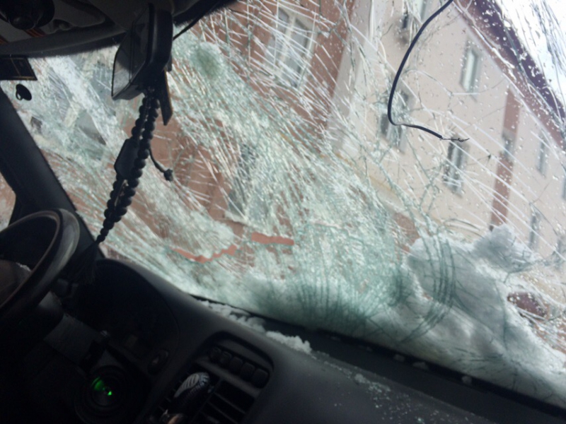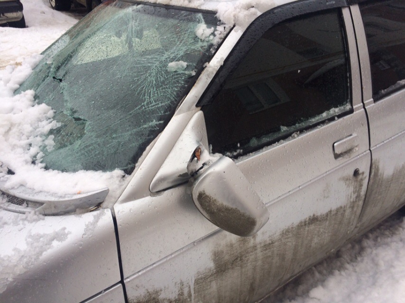 В результате инцидента крыша легковушки оказалась сильно деформирована, разбито лобовое стекло, боковое зеркало отвалилось. Хозяин машины полагает, что это случилось из-за того, что коммунальная служба убрала оторванный ранее снегозадержатель, а новый не поставила.