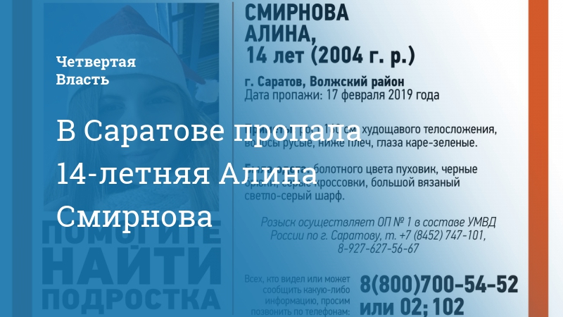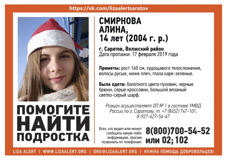 В Саратове пропала 14-летняя Алина Смирнова. Об этом сегодня, 18 февраля, сообщает поисковый отряд «Лиза Алерт».