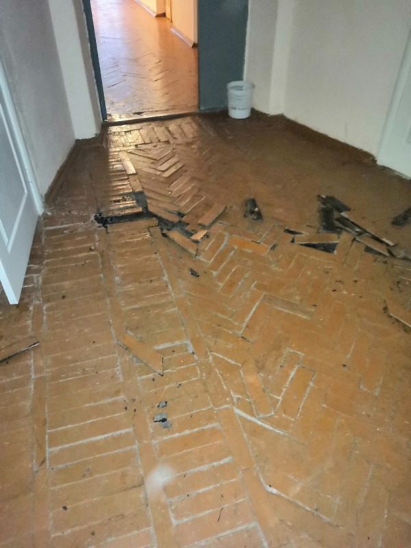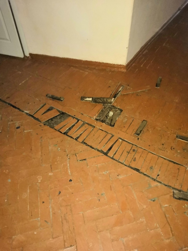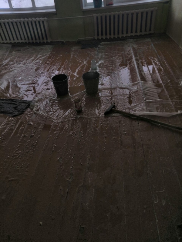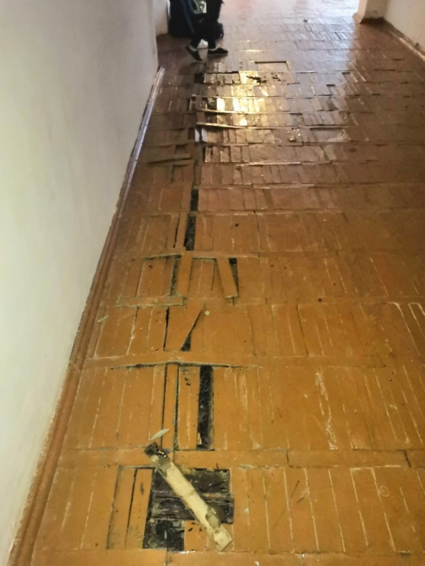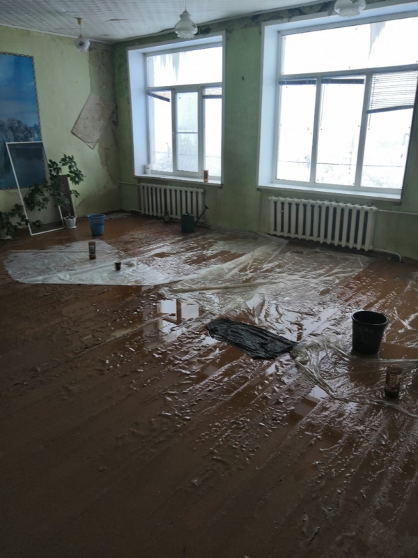На фотографиях видно, что стены пропитаны влагой, а на полу вспучился и разрушается паркет. В некоторых местах полы накрыты пленкой, а под очаги протечек подставлены ведра.