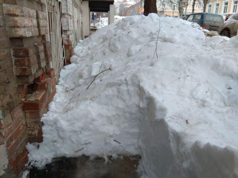 Периодически оказывается заваленным тротуар по улице Московской. Судя по всему, собственники зданий, очищая крышу от снега, просто сваливают его на пешеходную дорожку. Подобные действия приводят к тому, что обойти препятствие становится проблематично: возле дома №52 по Московской пройти можно только узкой тропинкой почти по проезжей части.