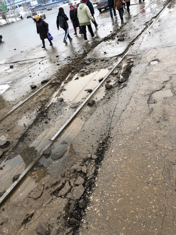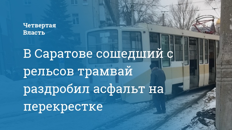 В Саратове сошедший с рельсов трамвай раздробил асфальт на перекрестке