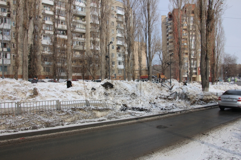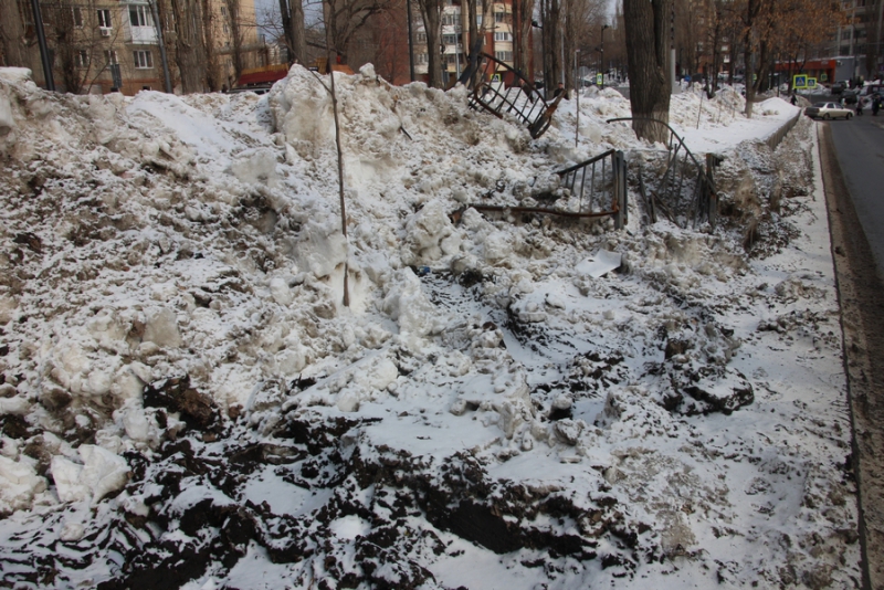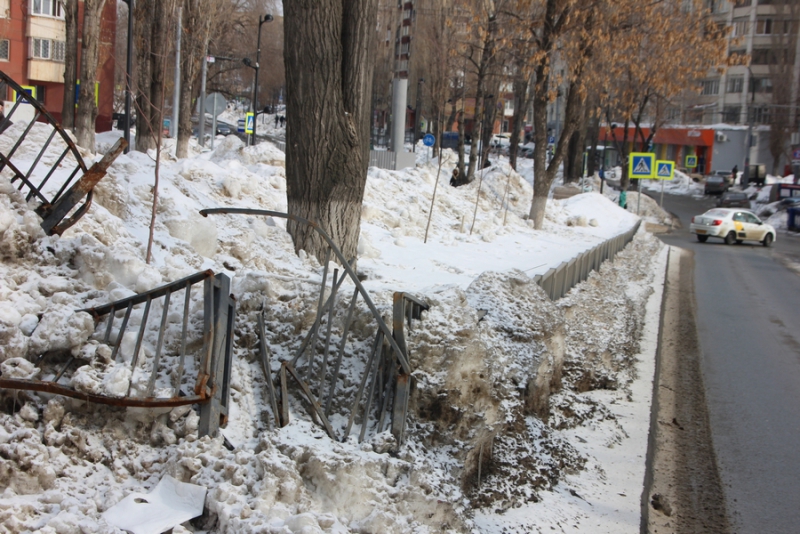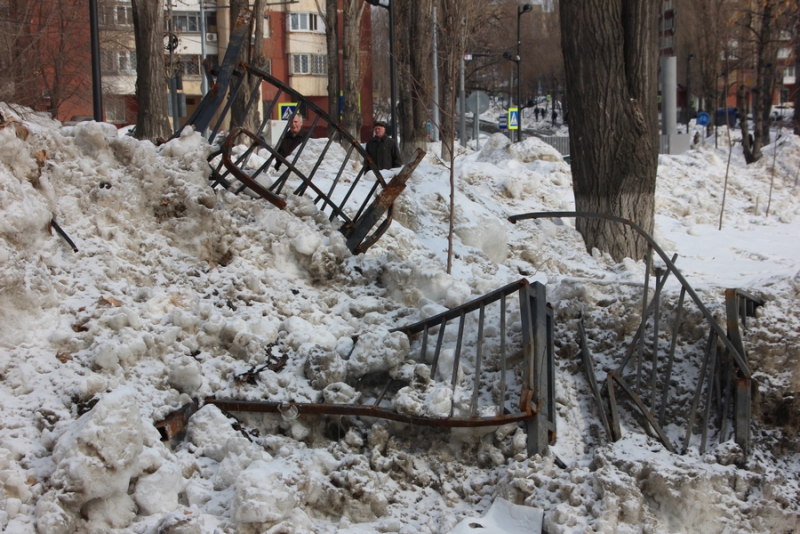По словам корреспондента «Четвертой Власти», на месте разрушения видны следы тяжелой техники: видно, что она была здесь неоднократно. При этом снег оказался навален за этот участок, ближе к пешеходной зоне. Возможно, техника чистила проезжую часть и парковку и попыталась выкинуть снег на бульвар, повредив ограждение.