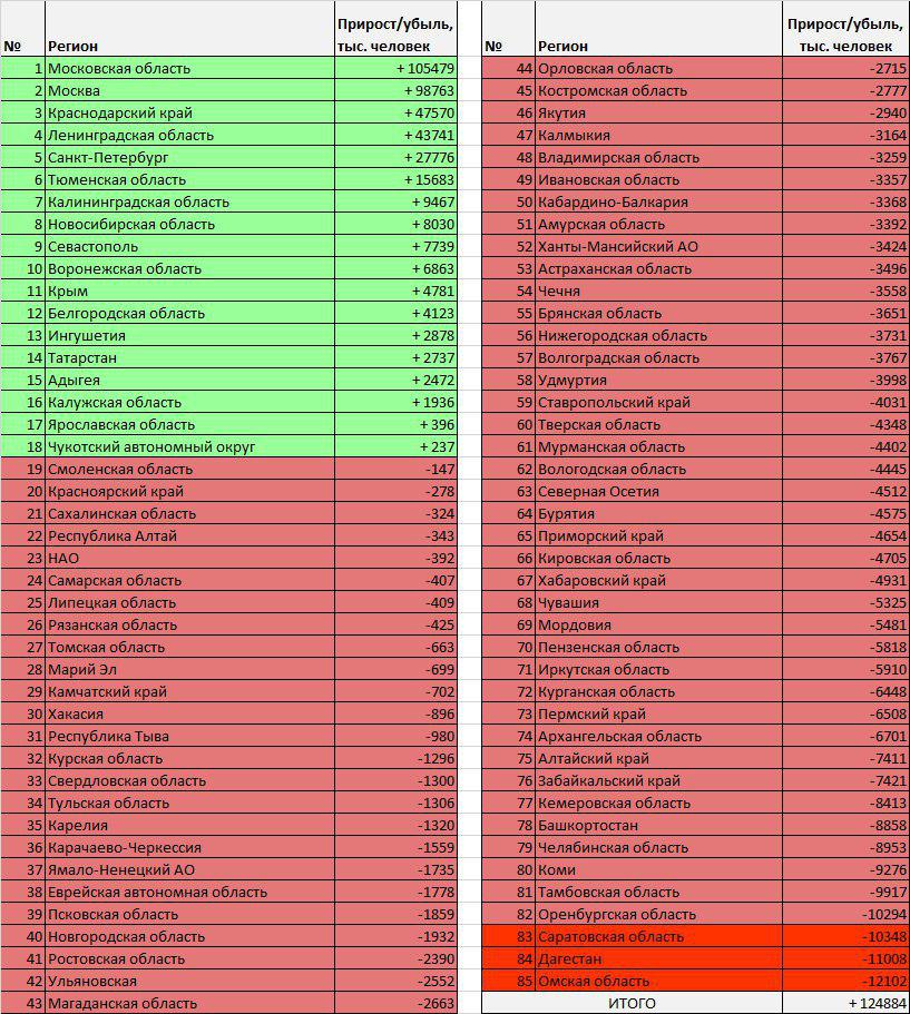 Из 85 регионов России миграционный прирост наблюдался в 18 субъектах. Больше всего он был в Московской области (+105479 человек), Москве (+98763 человека) и Краснодарском крае (+47570 человек).