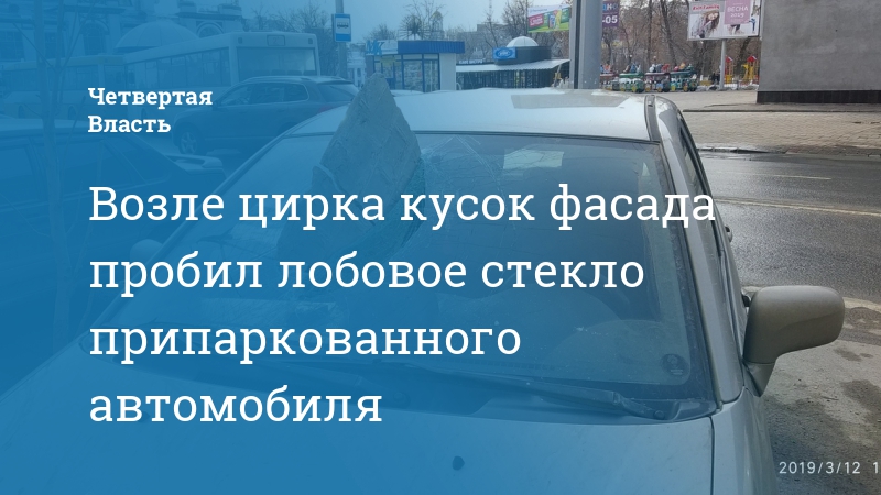 Возле цирка кусок фасада пробил лобовое стекло припаркованного автомобиля