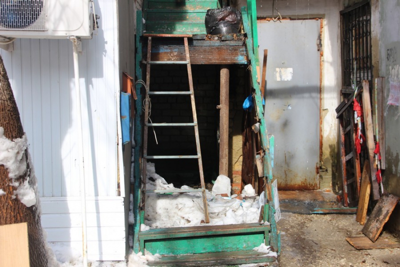 В центре Саратова горожане второй день вынуждены лазить на второй этаж своего дома по приставной лестнице, потому что УК не восстанавливает основную лестницу, разрушенную глыбами льда.
