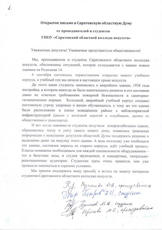 «Мы просим поддержать нашу просьбу и встать на защиту интересов студентов Саратовского областного колледжа искусств», - призвали саратовцы и оставили около 200 подписей под обращением (в общей сложности 13 страниц).